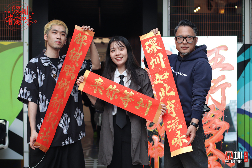 記者張藝齡與藝術(shù)家阿甘(左)和尹小龍(右)展示阿甘為”深圳有滋味“欄目寫的創(chuàng)意春聯(lián)