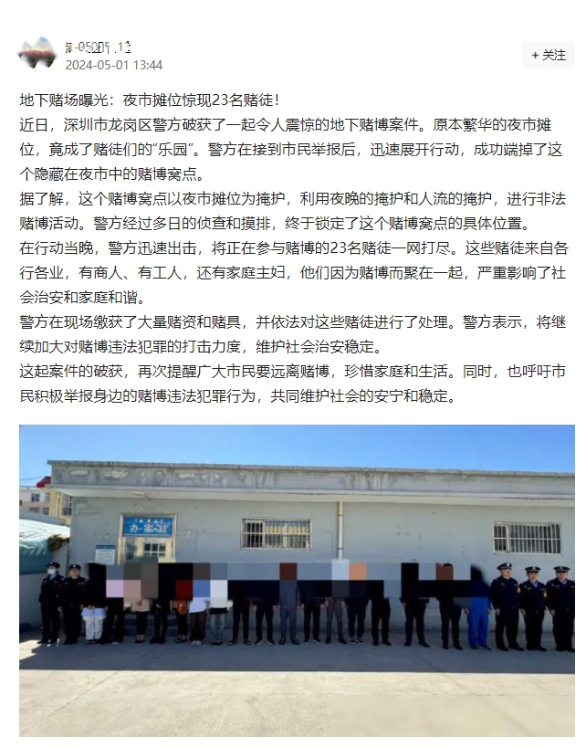 有網(wǎng)民在某社交平臺發(fā)帖稱:“近日,深圳市龍崗區(qū)破獲了一起令人震驚的地下賭博案件。原本繁華的夜市攤位,竟成了賭徒們的‘樂園’。”龍崗區(qū)相關部門第一時間對該內(nèi)容進行核查,確認此消息不實,龍崗區(qū)沒有發(fā)生此類案件。