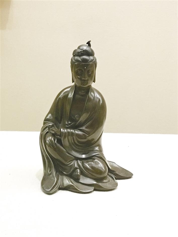其中,最引人注目的莫過于展覽海報(bào)上呈現(xiàn)的“景德鎮(zhèn)白釉瓷塑觀音菩薩像”,產(chǎn)于南宋時(shí)期,整尊瓷塑構(gòu)思既簡約又精巧,以粗線條捏塑形體與衣紋,胸前瓔珞精致,人物形象傳神,充分展現(xiàn)了宋代瓷塑藝術(shù)的審美意韻與高超技藝。令人嘖嘖稱贊的還有明中晚期的“銅觀音菩薩像”。此像采用暹羅國(今泰國)所貢優(yōu)質(zhì)風(fēng)磨銅鑄造,工藝精細(xì),撫之如嬰兒肌膚,嵌銀絲,背后銀絲鑲嵌方章銘款“石叟”二字,當(dāng)出自石叟本人之手。據(jù)了解,石叟為明代晚期鑄銅塑像名匠,僧人身份,現(xiàn)存中晚明觀音銅像中尚有部分“石叟”款,真品珍貴稀罕。