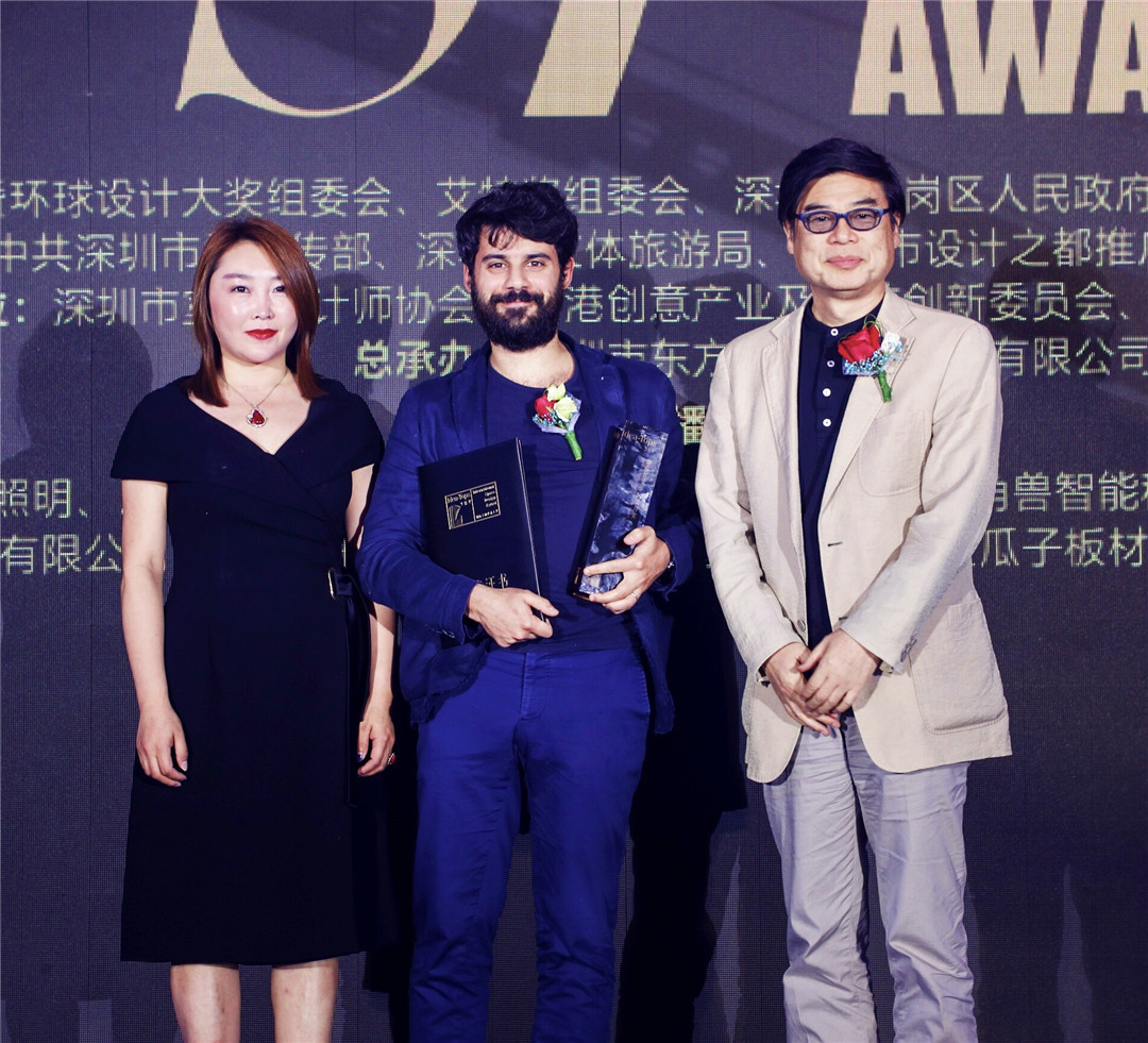△國家發(fā)展和改革委員會國際合作中心新聞信息辦公室主任仲文娟,中國美術(shù)家協(xié)會環(huán)境藝術(shù)委會副主任、深圳大學(xué)教授蔡強(qiáng)為Peter Pichler Architecture公司設(shè)計(jì)師頒發(fā)“最佳餐飲空間設(shè)計(jì)獎”