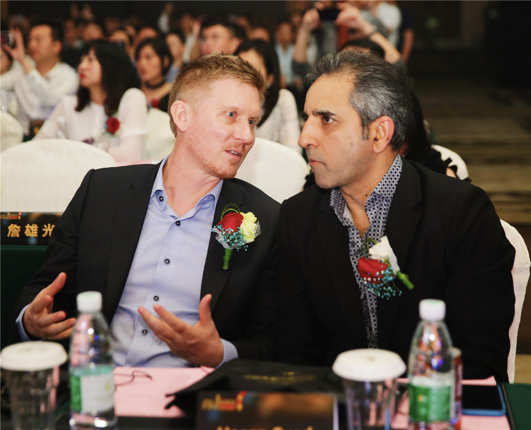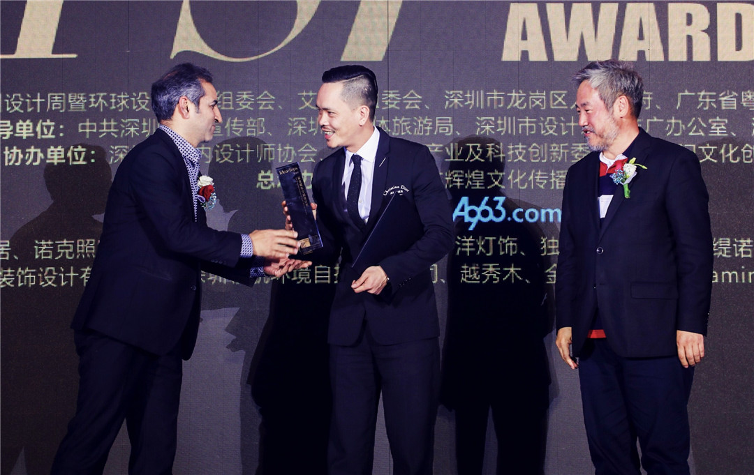 △中央美術(shù)學(xué)院建筑設(shè)計(jì)研究院院長、博士生導(dǎo)師王鐵,美國Gensler上海公司總監(jiān)Hasan Syed為廣州設(shè)計(jì)師黃永才頒發(fā)“最佳娛樂空間設(shè)計(jì)獎”