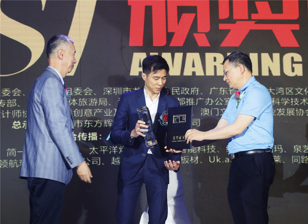 △廣東省粵港澳大灣區(qū)文化創(chuàng)意產(chǎn)業(yè)促進(jìn)會會長張宇航、哈佛大學(xué)建筑設(shè)計(jì)博士、臺灣亞洲大學(xué)副校長劉育東為臺灣設(shè)計(jì)師沈中怡頒發(fā)“最佳綠色建筑設(shè)計(jì)獎”