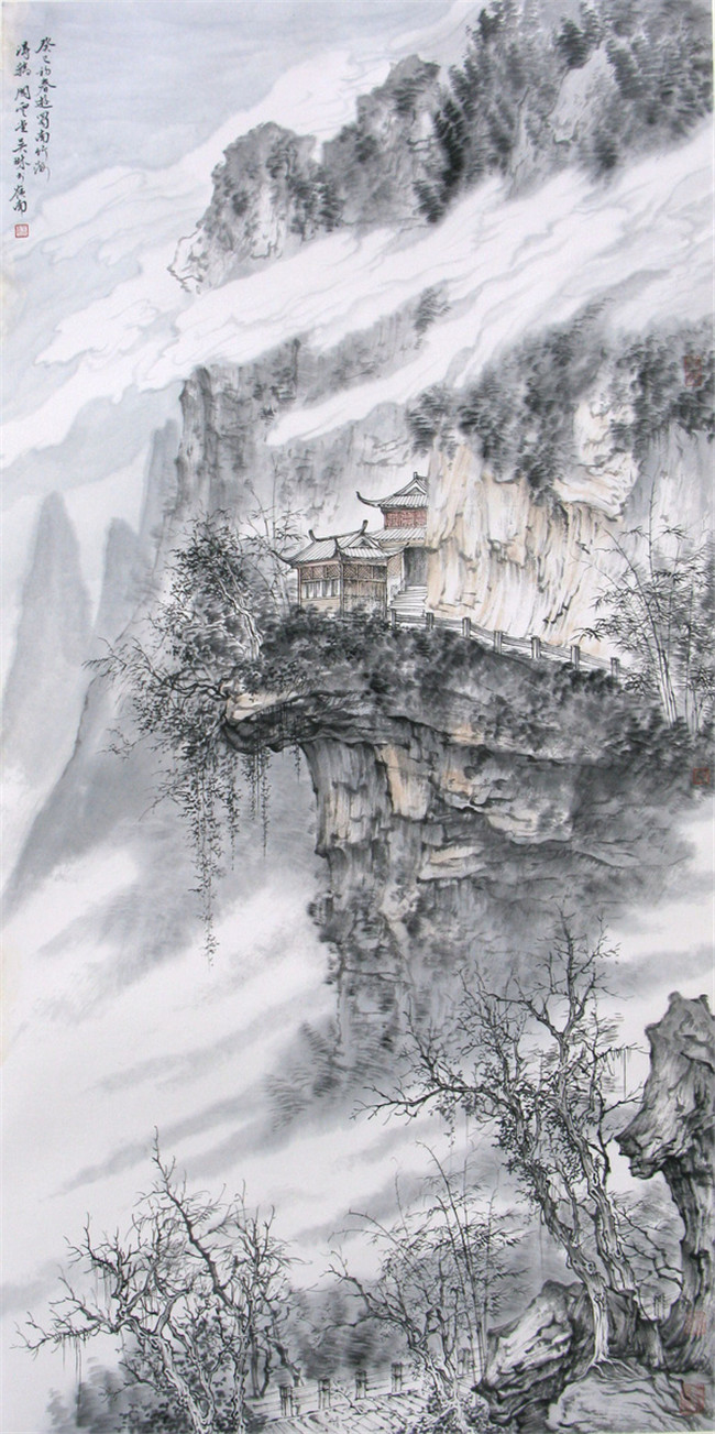 巨幅山水《江西明月山青云棧道》125*125cm