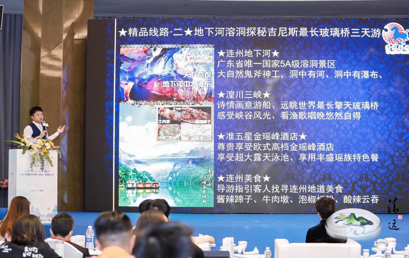 文化是旅游的靈魂,旅游是文化的載體。近年來,清遠(yuǎn)依托自然資源稟賦和深厚的文化底蘊(yùn),多措并舉推動(dòng)文旅融合發(fā)展,文旅產(chǎn)業(yè)呈現(xiàn)欣欣向榮局面。現(xiàn)場(chǎng),清遠(yuǎn)市珠水美悅酒店管理有限公司總經(jīng)理宋玉亮、清遠(yuǎn)市古龍峽生態(tài)旅游娛樂有限公司營銷專員林嘉儀、清遠(yuǎn)市愛地旅游發(fā)展有限公司營銷經(jīng)理?xiàng)钍婧啤⑶暹h(yuǎn)市國業(yè)旅游開發(fā)有限公司常務(wù)副總經(jīng)理韓勇,依次以圖文并茂、聲畫結(jié)合的形式,推介了美林湖景區(qū),古龍峽景區(qū),連州地下河、湟川三峽、龍?zhí)犊蜅?、擎天玻璃橋、連州大酒店,峰林曉鎮(zhèn)、洞天仙境,讓與會(huì)人員身臨其境感受山水清遠(yuǎn)的魅力;清遠(yuǎn)市國旅國際旅行社有限責(zé)任公司業(yè)務(wù)總監(jiān)李國華則現(xiàn)場(chǎng)推介了古龍峽云天玻霸兩天游、地下河溶洞探秘及吉尼斯最長(zhǎng)玻璃橋三天游等5條精品旅游線路,現(xiàn)場(chǎng)“種草”清遠(yuǎn)眾多網(wǎng)紅打卡點(diǎn)。
