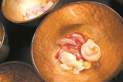 頭盤 “荷塘魚趣”,主角黃花魚來自世界第三大江——長江。步步生蓮是東方禪意,蓮子依依是情誼,蓮藕結(jié)結(jié)是路路通達(dá),Alvin Leung此次演繹的中式料理充滿東方元素,表達(dá)的是和諧交融。主菜“日式鮮味香烤和?!笔侨毡局鲝NHisamitsu Hataji 之作,他用創(chuàng)新手法融入經(jīng)典的日式料理中,表達(dá)一年四季食材與味道的關(guān)系,這是關(guān)于美食的光陰的故事。甜品出自Clement之手,是晚宴甜蜜的句號(hào)。