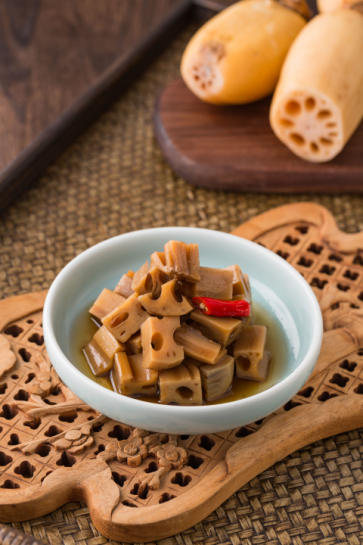 高壓鍋將藕蒸熟,脆軟適中,用醋、糖、醬油、辣椒調味,咸鮮酸甜,微辣,是一道開胃下酒的小菜。