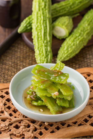 苦瓜又叫涼瓜,滌熱,明目,清心。通過冰鎮(zhèn)使苦瓜呈青翠瑩亮的半透明狀,青梅腌制的醬,降低了苦瓜的苦度,調和出酸甜適口、清涼甘苦的滋味。