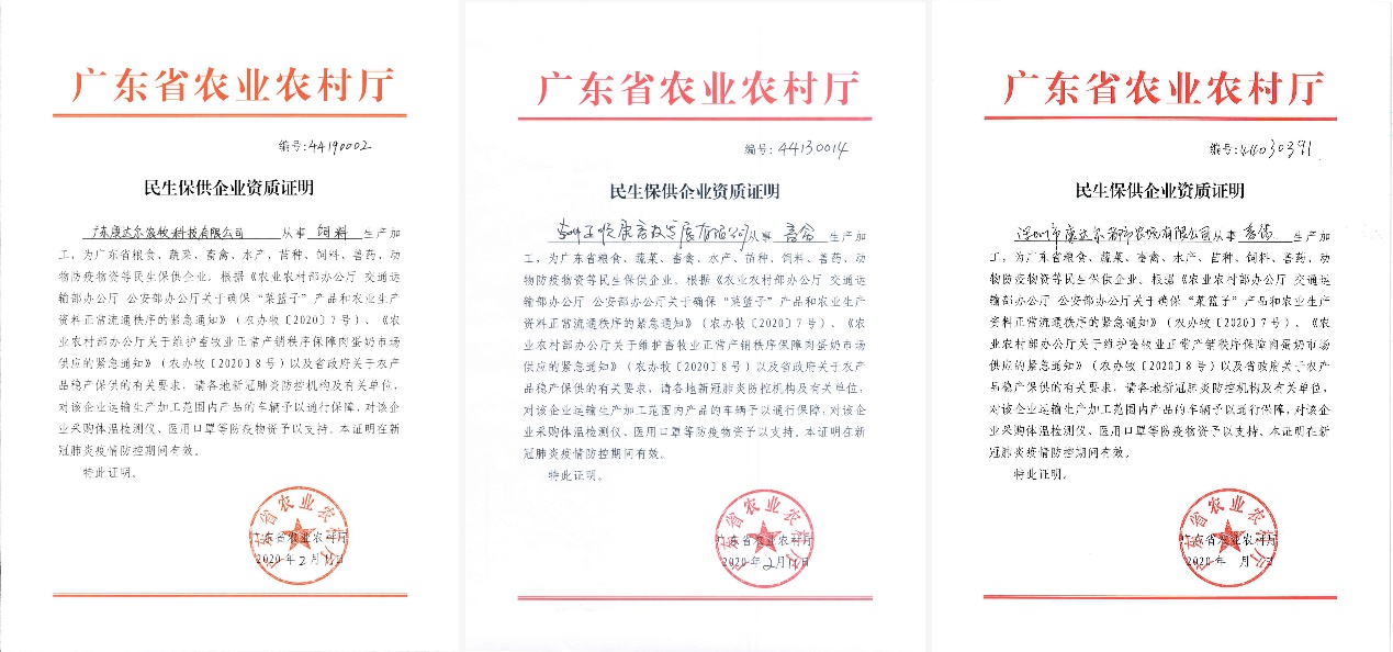 見圳客戶端·深圳新聞網(wǎng)2020年2月13日訊 農(nóng)產(chǎn)品是群眾生活必需品,農(nóng)業(yè)生產(chǎn)資料是農(nóng)業(yè)生產(chǎn)的必需物資。2020年2月11日-12日,康達爾集團農(nóng)業(yè)板塊三大公司廣東康達爾農(nóng)牧科技有限公司、惠州正順康畜牧發(fā)展有限公司、深圳市康達爾都市農(nóng)場有限公司先后獲批“民生保供企業(yè)”資質(zhì)證明,這將非常有利于各企業(yè)開展農(nóng)產(chǎn)品和農(nóng)業(yè)生產(chǎn)資料的保供工作,也意味著康達爾集團在這場防疫保供攻堅戰(zhàn)中所發(fā)揮的作用獲得了高度的肯定。