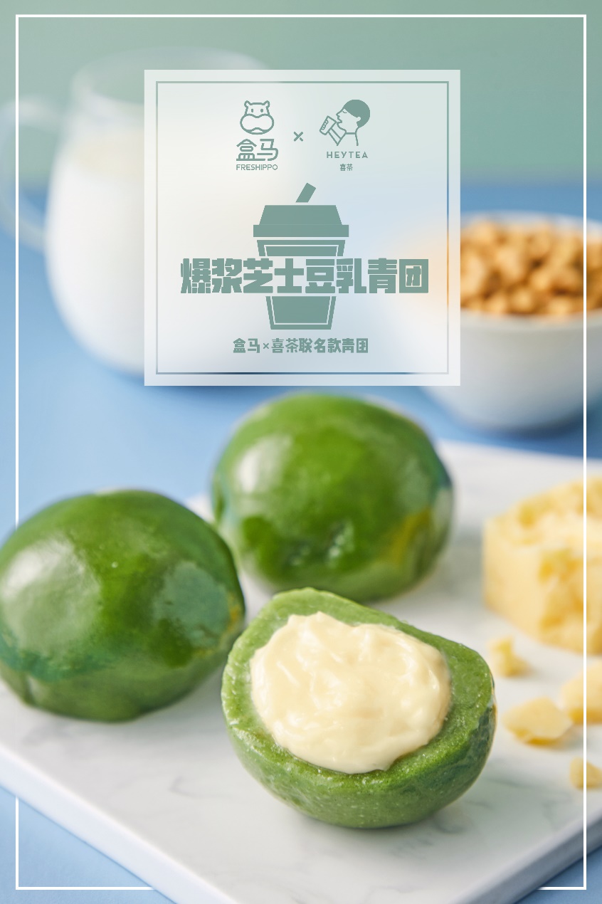 如何將流質(zhì)的奶茶包進(jìn)固態(tài)的青團(tuán)中,是令盒馬小二最頭疼的問題。阿華田波波青團(tuán)中,她嘗試著加入芋泥,不僅實(shí)現(xiàn)了將喜茶兩款熱門飲品(阿華田波波、芋泥波波)的口味相結(jié)合,還增加了餡心的厚實(shí)度,吃起來口感更加豐滿。而在爆漿芝士豆乳青團(tuán)中,盒馬的日日鮮醇豆?jié){派上了用場;11度的高濃度豆?jié){味道香醇,也更加濃稠。