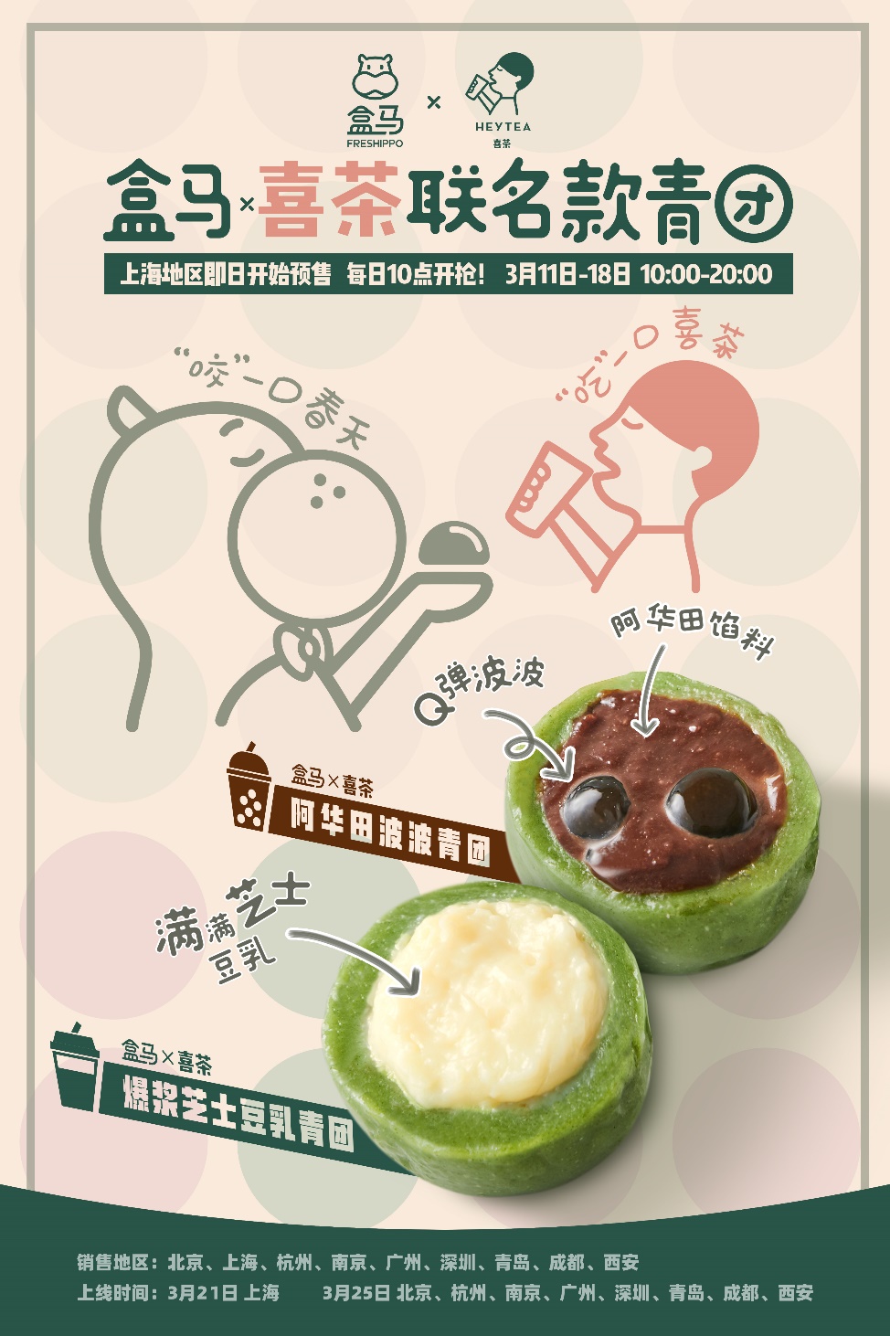 據(jù)了解,盒馬×喜茶聯(lián)名青團(tuán)于3月11日開啟上海地區(qū)的預(yù)售,3月21日將正式上線。北京、杭州、南京、廣州、深圳、青島、成都、西安等地將于3月25日上線,屆時(shí)消費(fèi)者可通過盒馬線上下單,30分鐘就能吃上春天的味道。