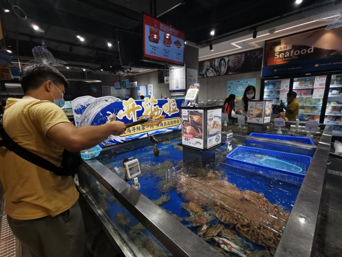 上市第一天,等待已久的市民們爭(zhēng)相購(gòu)買嘗鮮。盒馬廣東門店的梭子蟹價(jià)格49.9元/斤,周日早上11點(diǎn)不到,第一波入缸的海鮮已經(jīng)被搶空,門店迅速補(bǔ)貨。