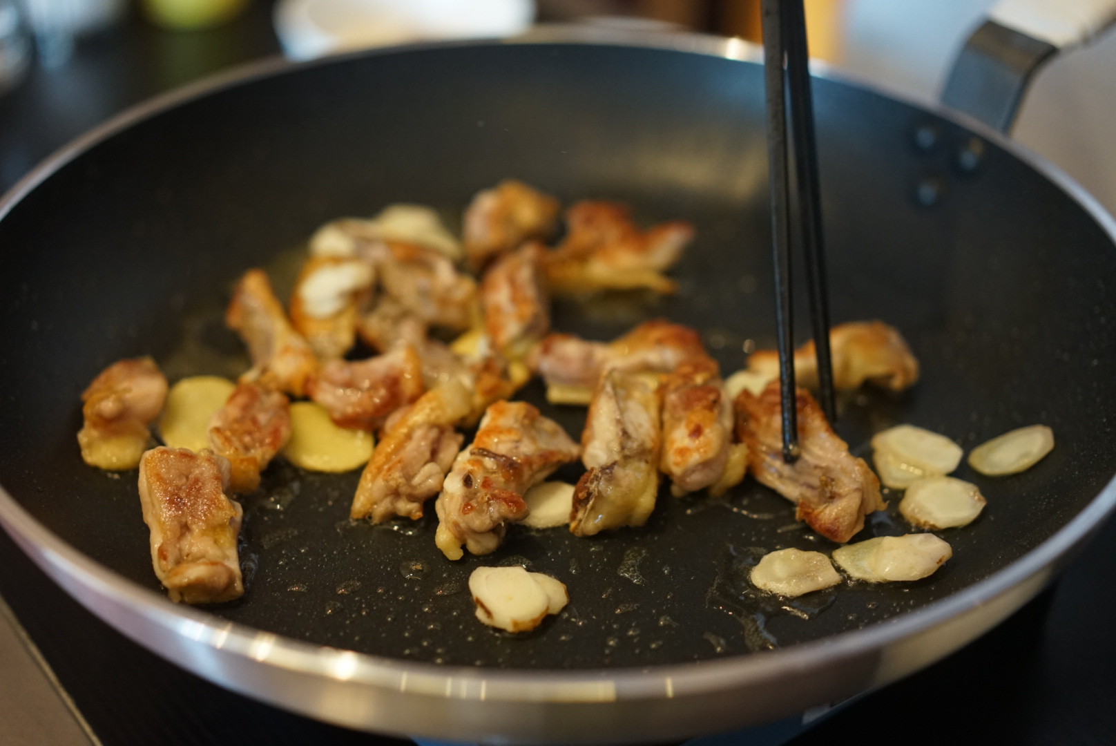 2、起煎鍋,食用油淡淡一層鋪煎鍋。放上雞件,將雞肉的一面朝下,雞皮朝上。在煎鍋的空余之地放上姜片熱一熱。待雞肉一面熟了以后,翻過(guò)另一面。