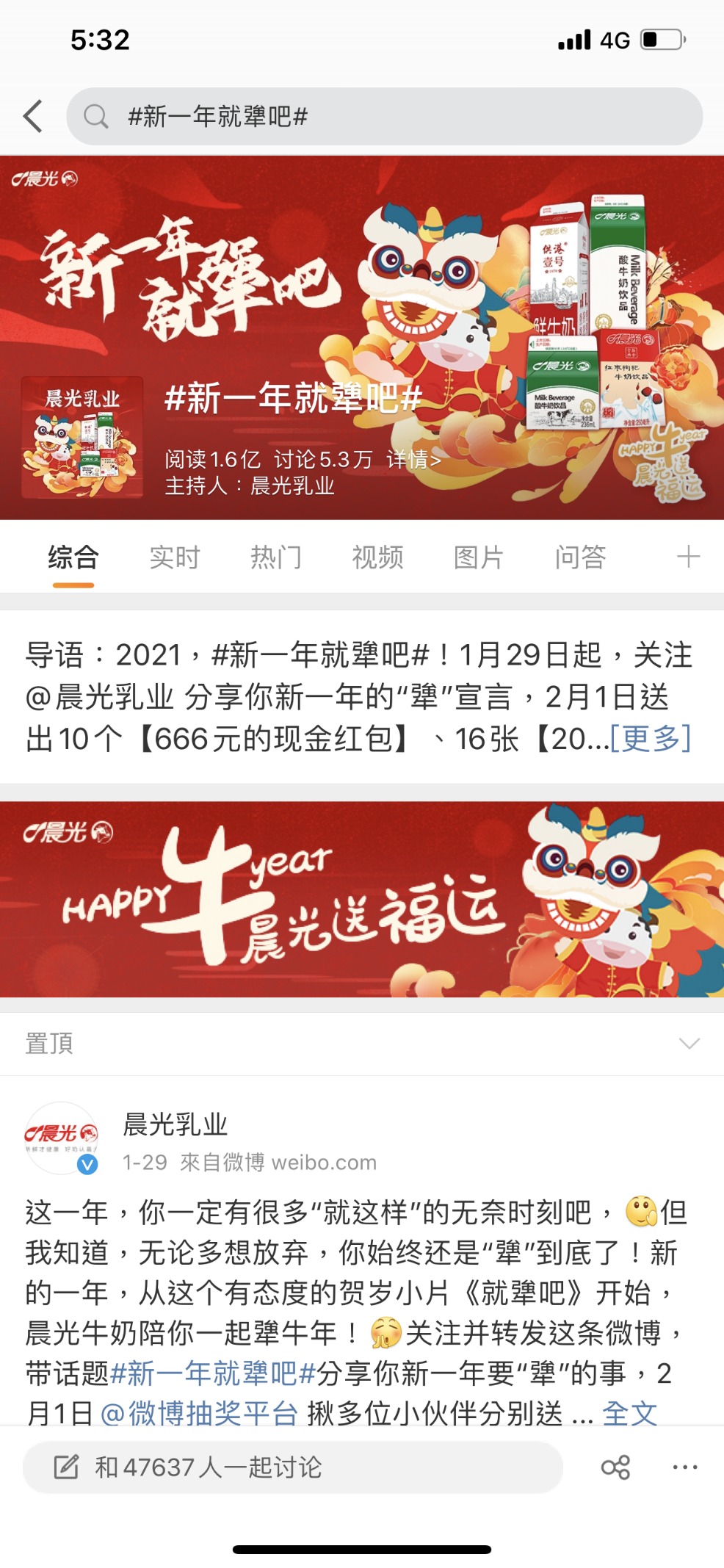 與此同時(shí),@晨光牛奶發(fā)起“犟到底”話題分享抽獎(jiǎng)活動,以“666元紅包”等“牛氣”獎(jiǎng)品刺激用戶參與話題討論。最終,話題 #新一年就犟吧#登陸微博熱搜榜第6位,僅兩日吸引1.5萬人參與討論,話題閱讀量突破1.6億。