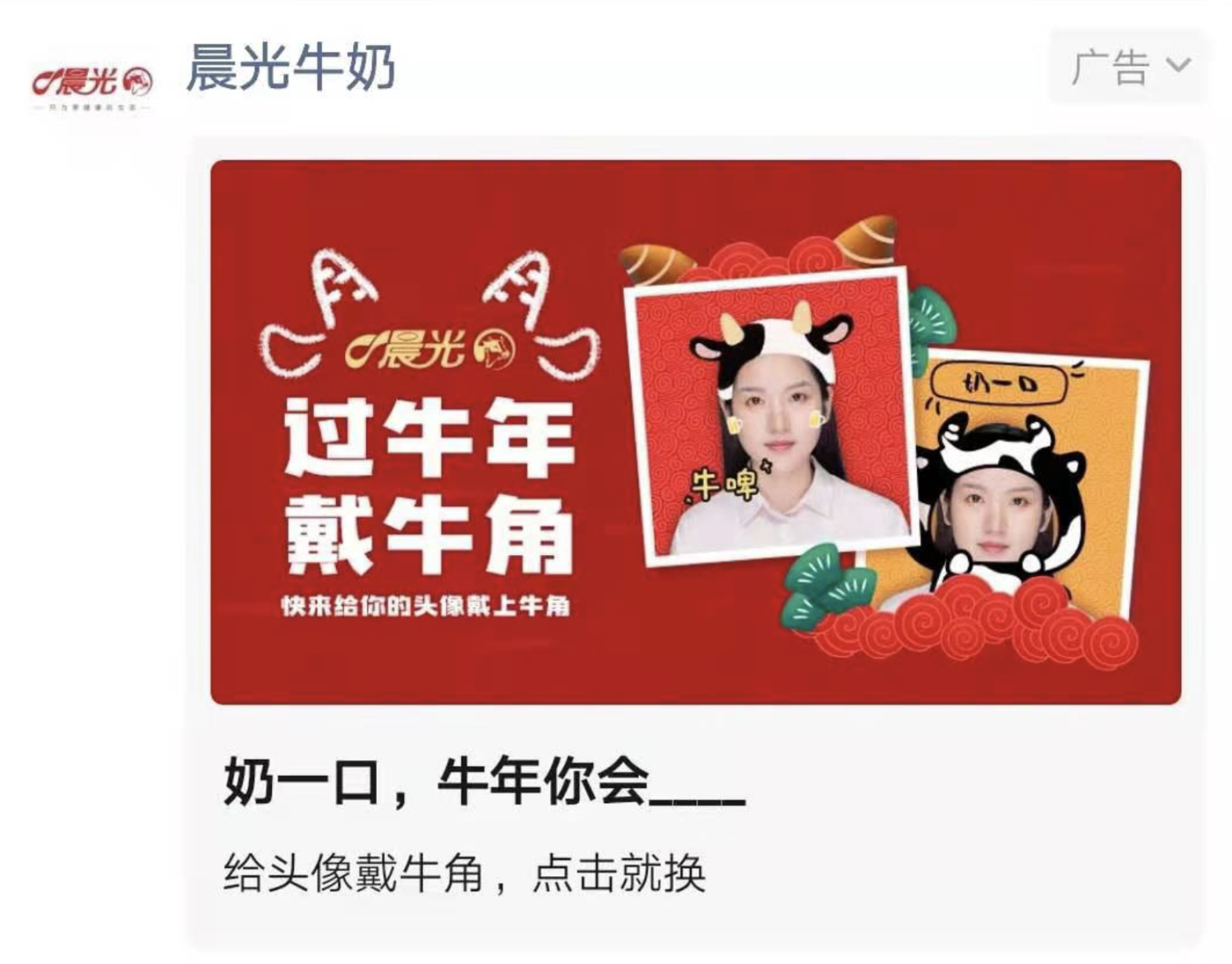 春節(jié),正是各大品牌爭相出招時(shí)刻,如何在一眾營銷活動中突出重圍吸引用戶關(guān)注?洞察到用戶在春節(jié)期間“換個(gè)喜慶頭像”以及“發(fā)紅包”的強(qiáng)需求,晨光乳業(yè)趣味游戲H5“換個(gè)頭像犟牛年”和“定制紅包”于除夕前上線,邀請用戶為現(xiàn)有微信頭像戴上“牛角”。牛角頭像不僅可以用于微信,也可用于其他社交平臺。