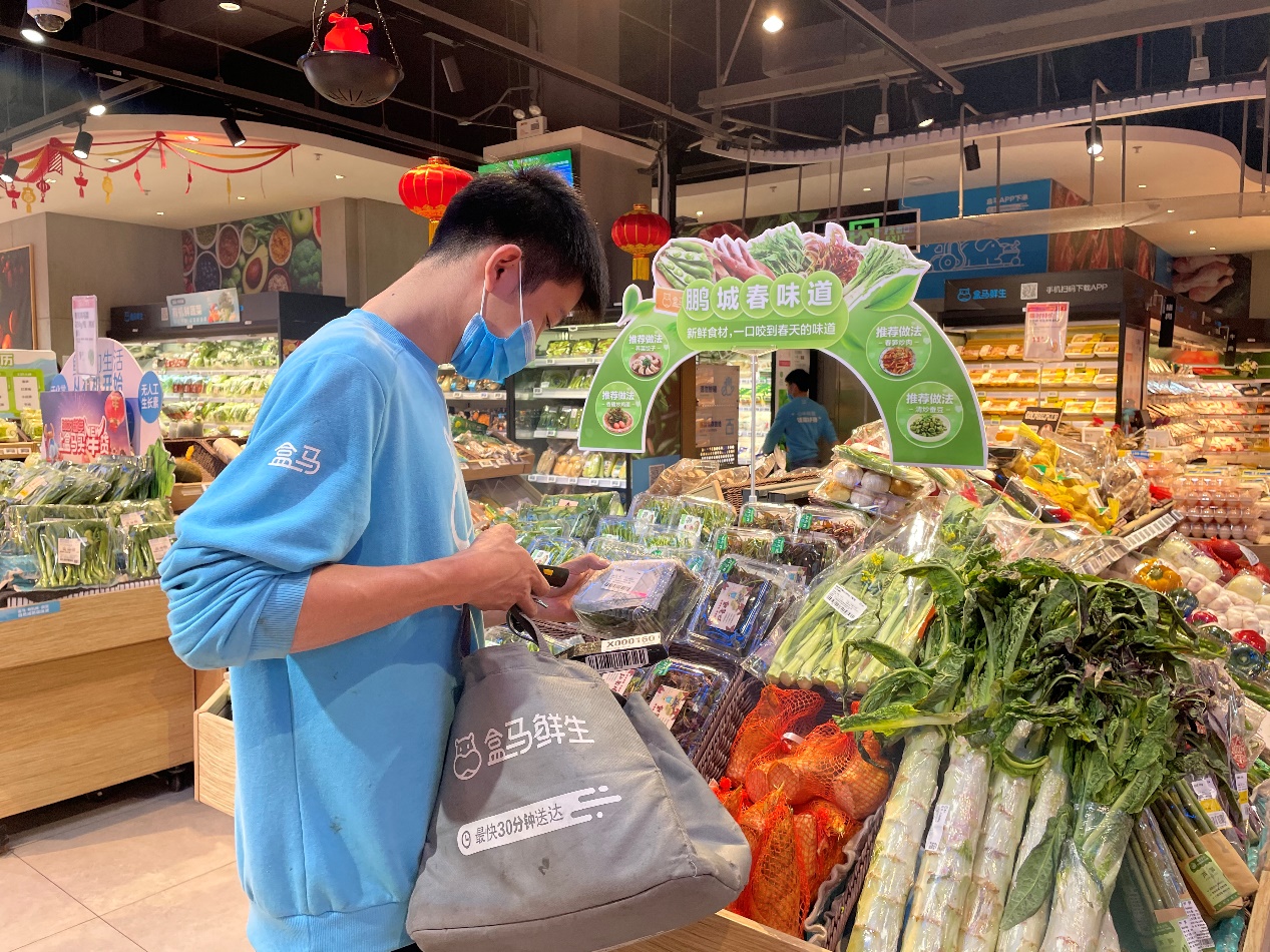 消費(fèi)者通過(guò)手機(jī)下單購(gòu)買(mǎi)春菜,盒馬小二正在揀貨