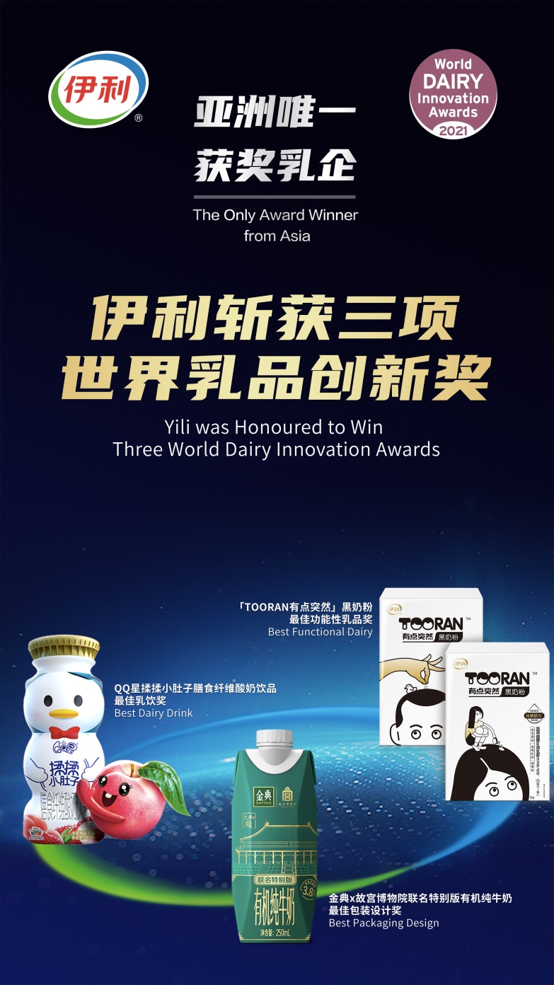 作為全球乳業(yè)的創(chuàng)新風(fēng)向標(biāo),世界乳品創(chuàng)新獎?wù)故玖巳蛉槠笤趧?chuàng)新方面取得的重要成果,本屆共有來自25個國家、20個類別的222個作品參賽。憑借領(lǐng)先的創(chuàng)新實(shí)力,伊利旗下產(chǎn)品獲得三項(xiàng)大獎:QQ星揉揉小肚子膳食纖維酸奶飲品獲得最佳乳飲獎、「TOORAN有點(diǎn)突然」黑奶粉獲得最佳功能性乳品獎、金典x故宮博物院聯(lián)名特別版有機(jī)純牛奶獲得最佳包裝設(shè)計(jì)獎。