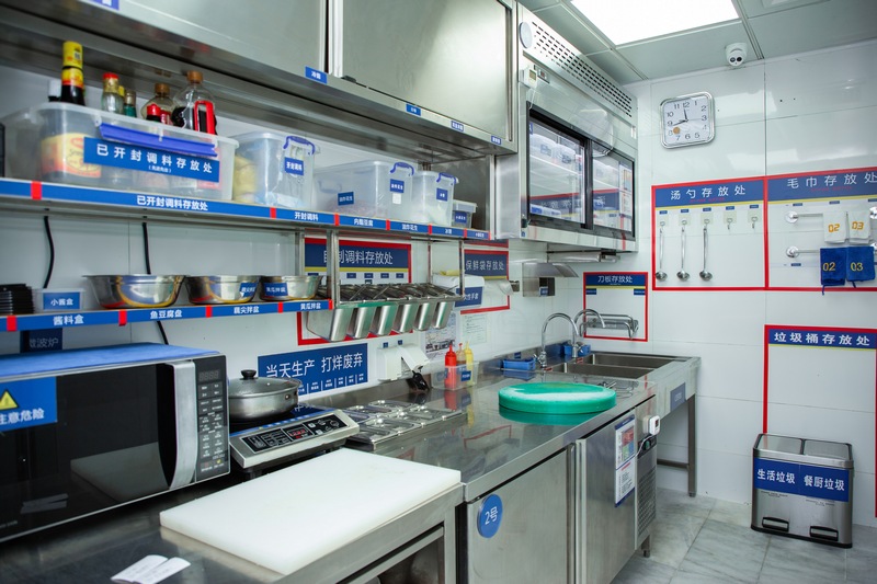 “右手邊是冷菜間,因?yàn)槭嘲惨蟾撸覀兌加袑iT的‘二次更衣室’,在這里更換衣服后,再進(jìn)入對(duì)涼菜進(jìn)行處理?!必?fù)責(zé)人表示,在專門的涼菜區(qū)里,則可以看到櫥窗中整齊地貼上了諸如“A1圣女果”“B04魚豆腐”之類的標(biāo)簽,同時(shí)備注“當(dāng)天生產(chǎn)打烊廢棄”和“加工日期與廢棄日期”等具體操作指示?!懊客泶蜢群?,我們也會(huì)用紫外線燈對(duì)冷菜間進(jìn)行半個(gè)小時(shí)的消毒。”負(fù)責(zé)人補(bǔ)充。