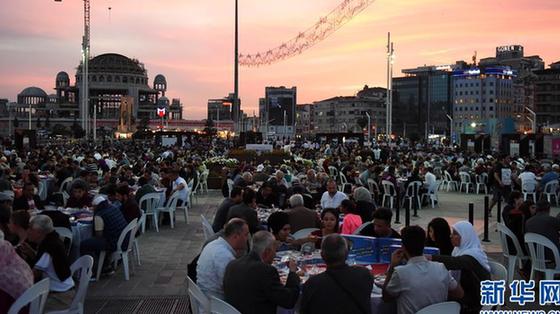 5月16日,在土耳其伊斯坦布爾塔克西姆廣場(chǎng),民眾在吃晚餐。日落后,伊斯坦布爾各城區(qū)為民眾提供免費(fèi)晚餐,慶祝齋月首日。