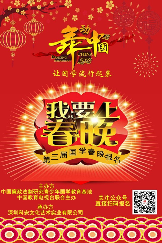 2019年第三屆國學(xué)春晚由青少年國學(xué)教育基地與中國教育電視臺(tái)聯(lián)合主辦,本次春晚打破以往以晚會(huì)為主導(dǎo)的籌辦模式,更注重國學(xué)文化的推廣及全民國學(xué)才藝的選拔。首次以主辦方的報(bào)道與宣傳規(guī)模在全國范圍內(nèi)進(jìn)行海選。以“舞動(dòng)中國”為主題在全國范圍內(nèi)進(jìn)行強(qiáng)勢(shì)推廣,發(fā)出中國國學(xué)文化領(lǐng)域的最強(qiáng)音!在長(zhǎng)達(dá)4個(gè)多月的宣傳活動(dòng)期間,將不間斷運(yùn)用活動(dòng)背景、輻射人群、媒體資源、賽事平臺(tái)及網(wǎng)絡(luò)優(yōu)勢(shì)等方式弘揚(yáng)國學(xué)。