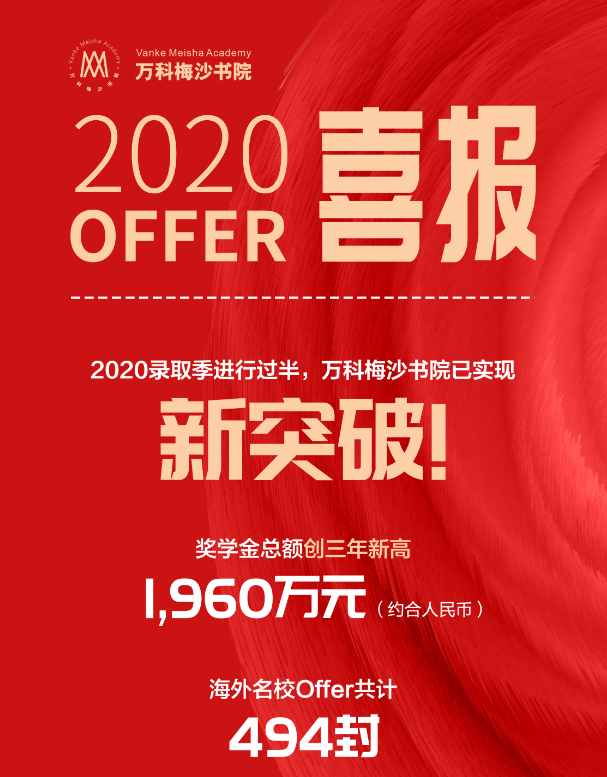2020申請季還未結(jié)束,梅沙學(xué)子已收獲494封海外名校錄取Offer,獎學(xué)金累計約合人民幣1,960萬元,創(chuàng)三年新高。其中,來自美國Top100綜合性大學(xué)及文理學(xué)院的錄取通知書有356份,來自美國Top50綜合性大學(xué)及文理學(xué)院的錄取通知書有180份。