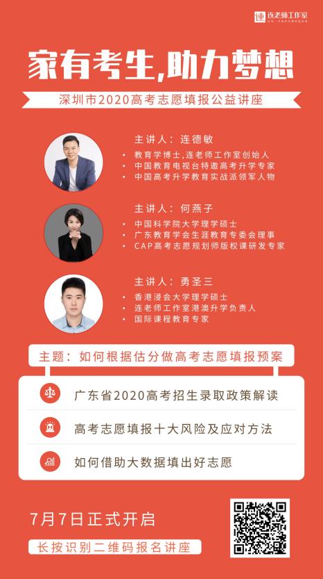 據(jù)悉,連老師工作室深圳市2020高考志愿填報(bào)公益講座接下來(lái)還會(huì)連續(xù)舉辦四場(chǎng)線下公益講座,講座均由連德敏博士主講,以“如何根據(jù)分?jǐn)?shù)做高考志愿填報(bào)預(yù)案”為主題,解讀廣東省2020高考招生錄取政策,分享高考志愿填報(bào)十大風(fēng)險(xiǎn)及應(yīng)對(duì)方法以及如何借助大數(shù)據(jù)填出好志愿等精彩內(nèi)容,幫助廣東省考生和家長(zhǎng)更好的完成志愿填報(bào)。