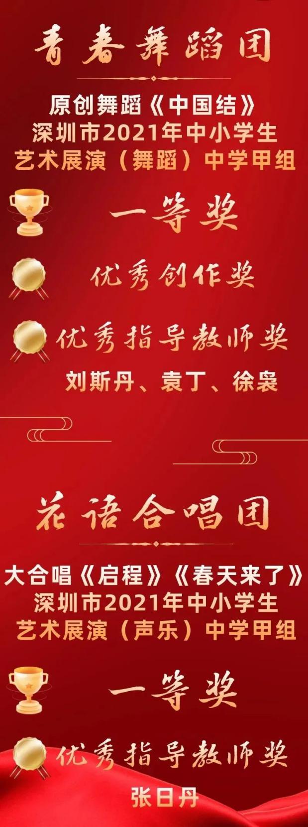 二實青春舞蹈團以原創(chuàng)作品《中國結(jié)》在全市各區(qū)以及市直屬學(xué)校選拔出來的37個節(jié)目中脫穎而出,獲得全場最高分!接下來,青春舞蹈團將代表深圳市參加省賽,有望沖擊全國決賽!此外,二實花語合唱團也憑借大合唱《啟程》《春天來了》榮獲深圳市2021年中小學(xué)藝術(shù)展演(聲樂)中學(xué)甲組一等獎。劉斯丹、袁丁、徐裊、張日丹等老師榮獲優(yōu)秀指導(dǎo)老師獎。