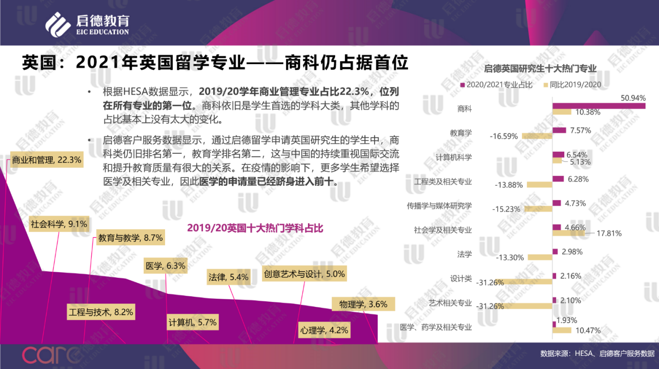 長(zhǎng)期以來(lái),由于其廣闊的就業(yè)前景,F(xiàn)AME專業(yè)(金融、會(huì)計(jì)、管理、經(jīng)濟(jì))和STEM專業(yè)(科學(xué)、技術(shù)、工程和數(shù)學(xué))一直備受留學(xué)生的青睞。2021 《美國(guó)門(mén)戶開(kāi)放報(bào)告》數(shù)據(jù)顯示,半數(shù)以上的中國(guó)內(nèi)地學(xué)生就讀STEM專業(yè)(物理/自然科學(xué)、工程學(xué)、醫(yī)療健康、數(shù)學(xué) /計(jì)算機(jī) ),16.6%就讀商業(yè)與管理專業(yè)。英國(guó)高等教育統(tǒng)計(jì)局 HESA數(shù)據(jù)顯示,2019/20學(xué)年商業(yè)管理專業(yè)占比為22.3%,位列在英國(guó)研究生專業(yè)的第一位,其他依次為:社會(huì)科學(xué)、教育與教學(xué)、工程與技術(shù)、醫(yī)學(xué)、計(jì)算機(jī)、法律、創(chuàng)意藝術(shù)與設(shè)計(jì)、心理學(xué)以及物理學(xué)。