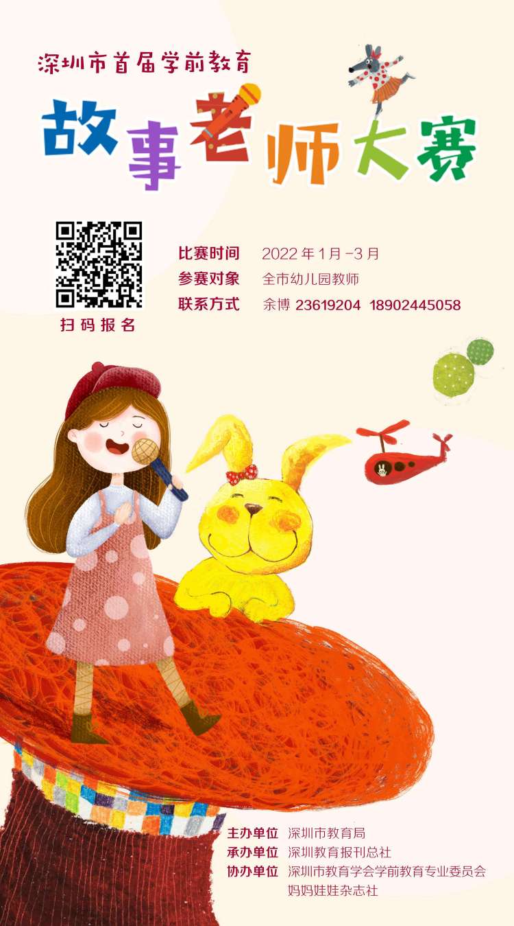 讀特客戶端·深圳新聞網(wǎng)2022年1月12日訊 (記者 陳彬 通訊員 程玉珂)由深圳市教育局主辦,深圳教育報刊總社承辦,深圳市教育學會學前教育專業(yè)委員會、媽媽娃娃雜志社協(xié)辦的深圳市首屆學前教育“故事老師”大賽暨原創(chuàng)繪本大賽將于2022年1-3月舉辦。