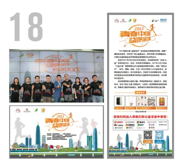 由深圳市廣電公益基金會(huì)、深圳市青少年發(fā)展基金會(huì)等主辦,深圳棠果影視傳媒有限公司承辦?!?017青春中國(guó)益跑深圳”活動(dòng)作為創(chuàng)意公益募捐慈善活動(dòng),通過(guò)招募深圳市民自愿以“綠色出行”(步行、慢跑、地鐵、公交)的方式完成城市穿越,從而為10個(gè)社會(huì)慈善項(xiàng)目進(jìn)行募捐的大型公益活動(dòng)。