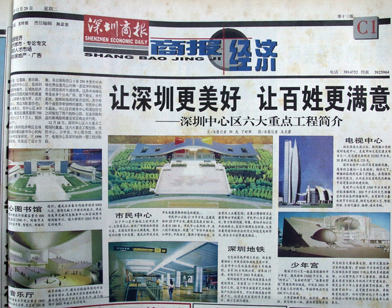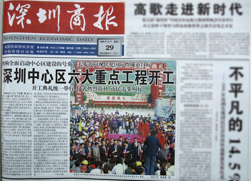1998年12月29日,深圳商報(bào)頭版報(bào)道深圳中心區(qū)六大重點(diǎn)工程開(kāi)工