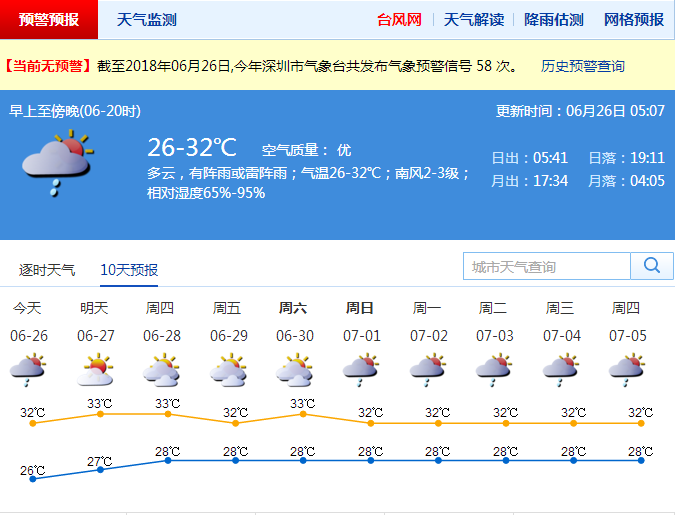 深圳新聞網(wǎng)6月26日訊(記者 何暢)昨天夜間到今天白天,深圳陰天轉(zhuǎn)多云,有陣雨和雷陣雨,最大雨量出現(xiàn)在草埔站,為44.2毫米,早晨最低氣溫在25-26℃,白天最高氣溫在30-31℃;偏南風(fēng)2-3級;相對濕度70%-95%;全市能見度普遍在10-15公里,雨時(shí)能見度有所降低。