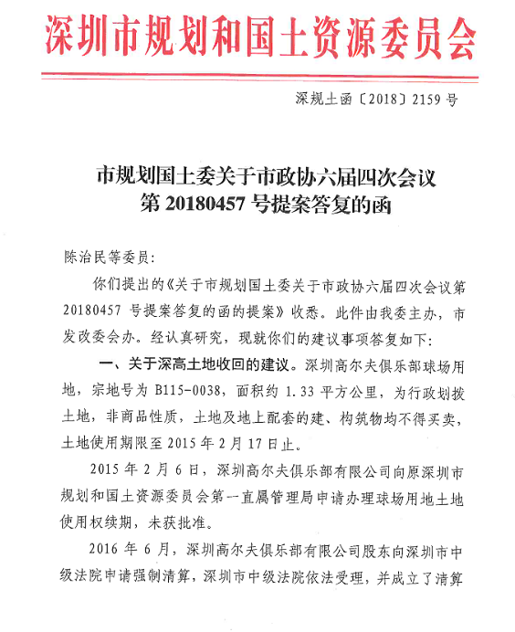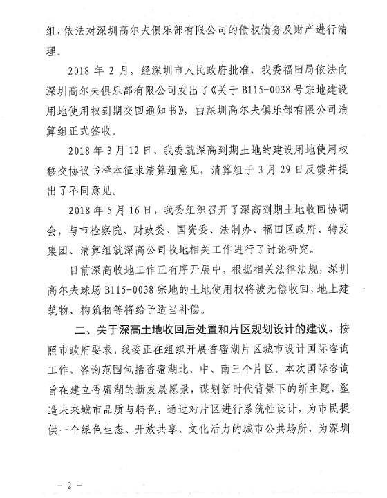 2018年2月,經深圳市人民政府批準,深圳市規(guī)土委依法向深圳高爾夫俱樂部有限公司發(fā)出了《關于B0015-0038宗地建設用地使用權到期交回通知書》,由深圳高爾夫俱樂部有限公司清算組正式簽收。