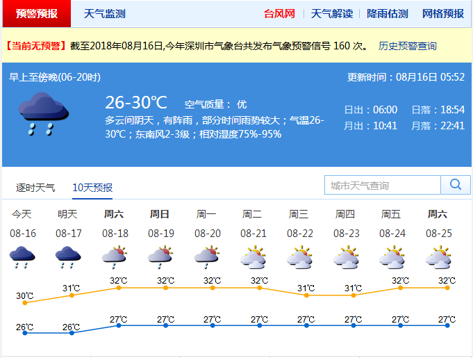 市氣象臺預(yù)計,8月16日受臺風(fēng)"貝碧嘉"外圍環(huán)流影響,深圳多間歇性的降雨,局部暴雨;沿海和高地最大陣風(fēng)可達6至7級。預(yù)計8月17日有陣雨;8月18日至20日多云有短時陣雨,天氣趨于炎熱。