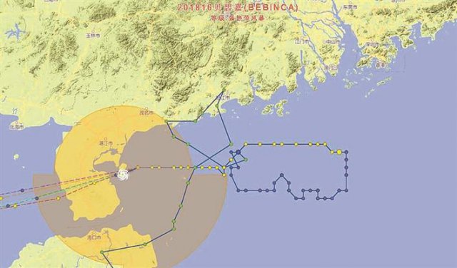 ▲臺風(fēng)"貝碧嘉"移動路徑曲折,昨晚已在廣東省雷州市沿海登陸。
