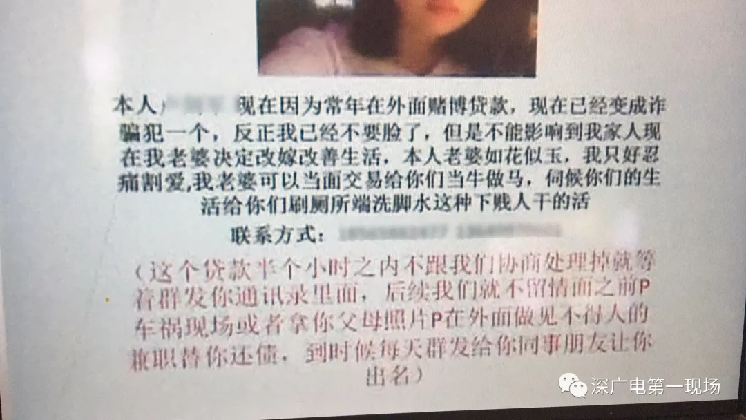 今天上午,記者在龍崗坪地一小區(qū)外見到了盧先生,他告訴記者,最近手機收到這樣一張圖片,圖片恰巧是他的一位女性朋友頭像,下面還配上一些關于“幫盧先生還債”的不實文字信息,內容是盧先生已經(jīng)成了詐騙犯,現(xiàn)在正在當“洗腳妹”幫盧先生還賬,圖片上還有盧先生的個人資料和電話號碼。