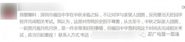 今天,深圳市高級中學(xué)、深圳市福田中學(xué)、沙井中學(xué)、東方英文書院的一些高中學(xué)生,通過在線留言等多種方式,向欄目反映,中秋節(jié)是法定假日,但他們卻沒法和家人一起吃飯團(tuán)聚,更別提賞月看晚會了,原因是學(xué)校要求寄宿的學(xué)生今天晚上要提早返校,參加晚自習(xí)或者考試。