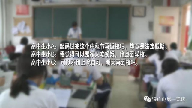 我們還了解到,就讀高三的學(xué)生只有周六放了一天假,從昨天開始就一直在上課,預(yù)計(jì)要上到國慶節(jié)才能休息,這樣算來,學(xué)生一共要連上 8 天的課程。
