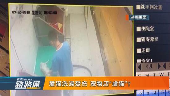 調(diào)取監(jiān)控后發(fā)現(xiàn),當(dāng)時(shí)給貓吹毛的工作人員動(dòng)作粗暴,在貓只抗拒躲閃的時(shí)候,有拖拽的動(dòng)作,期間還把貓騰空甩起頭撞到墻上。
