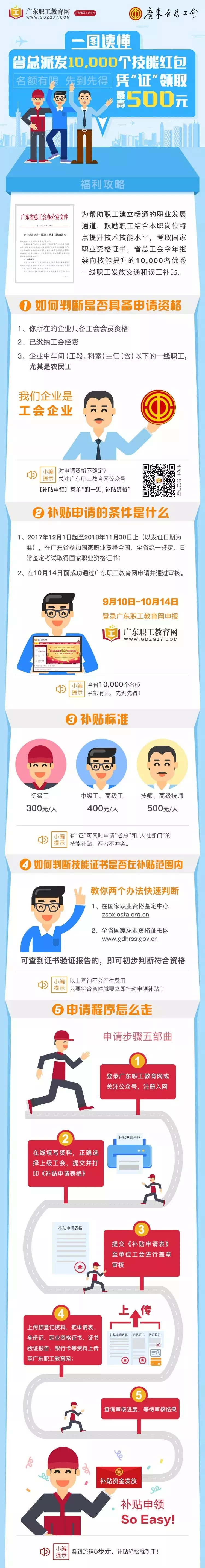 為提高我省產(chǎn)業(yè)工人隊伍素質(zhì),幫助更多產(chǎn)業(yè)工人提升技能水平,按照省總工會黨組會議通過的《廣東省總工會2018年產(chǎn)業(yè)工人大培訓行動組織實施方案》,省總工會繼續(xù)向10000名技能提升的優(yōu)秀產(chǎn)業(yè)工人發(fā)放交通和誤工補貼。取得職業(yè)資格證書可獲300~500元補貼,名額有限,先到先得!