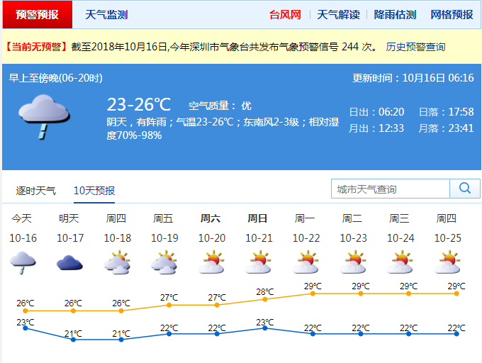 受弱冷空氣和切變線共同影響,16日深圳陰天有中到大雨,局部暴雨,伴有零散雷暴和5~6級(jí)陣風(fēng)。預(yù)計(jì)降雨將在中午前后減弱,氣溫下降3 ℃~4 ℃,最低氣溫低至21 ℃,最高氣溫在25 ℃左右。17日陰天間多云,偶有零星小雨,氣溫在21 ℃ ~26 ℃。18日起轉(zhuǎn)為多云到晴天,早晚清涼,空氣干燥。