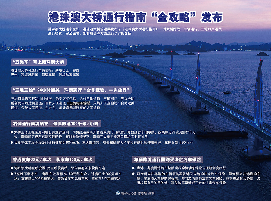 新華社廣州10月21日電(記者周強(qiáng))港珠澳大橋通車(chē)在即,港珠澳大橋管理局發(fā)布了《港珠澳大橋通行指南》,對(duì)大橋路線、車(chē)輛通行、三地口岸通關(guān)、通行收費(fèi)、安全保障、配套服務(wù)等方面進(jìn)行了詳細(xì)介紹。
