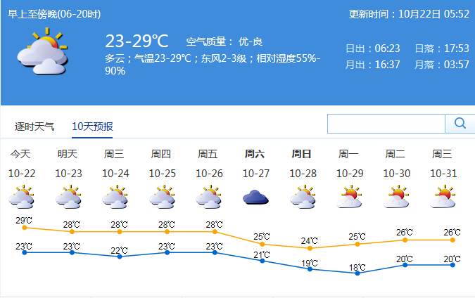 深圳新聞網訊 進入10月中旬,西太平洋上的臺風們終于“安靜”下來,冷空氣逐漸成為接下來的主角,我國北方城市也紛紛步入秋季。盡管全市在10月11日早晨全市最低氣溫普遍在20℃左右,但距真正入秋還有一定距離。據市氣象局預測,22日至26日我市大致多云,間中有小雨,最低氣溫22-24℃,最高氣溫27-29℃。