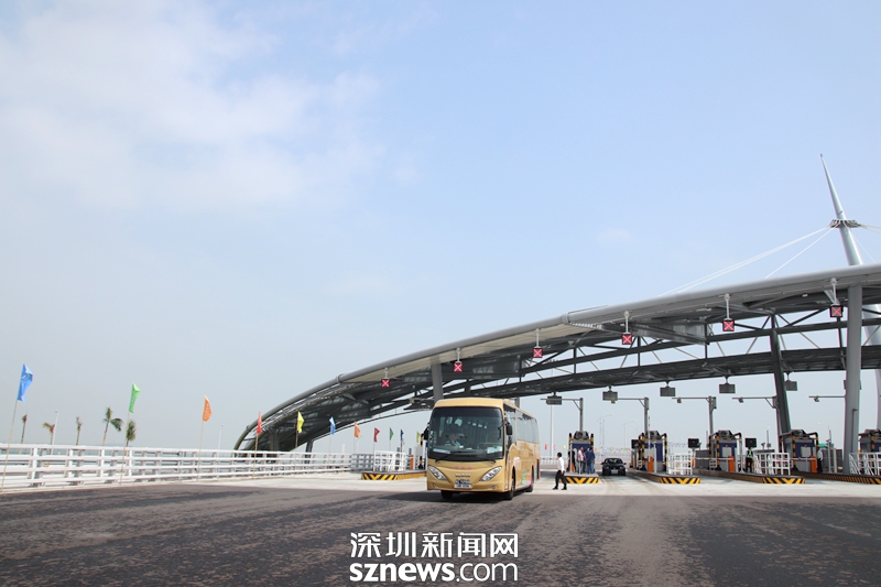 一輛穿梭巴士經(jīng)過港珠澳大橋珠海收費站