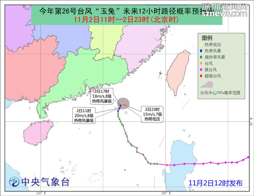 中央氣象臺(tái)于11月2日12時(shí)發(fā)布臺(tái)風(fēng)“玉兔”未來120小時(shí)路徑概率預(yù)報(bào)圖