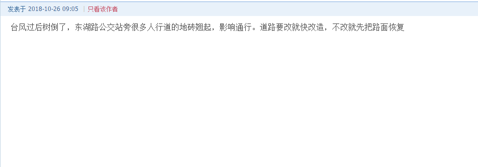 “再補(bǔ)一張,到2019年啦?!痹摼W(wǎng)友在發(fā)帖后的幾小時(shí)內(nèi),又補(bǔ)發(fā)了一張寫(xiě)有“2019年實(shí)施,2019年完工”的截圖。并配圖表示“臺(tái)風(fēng)過(guò)去快2個(gè)月了,東湖路的人行道石磚仍大片凸起,地鐵站前面的道路凹凸不平,從來(lái)沒(méi)有人來(lái)處理?!?/p>