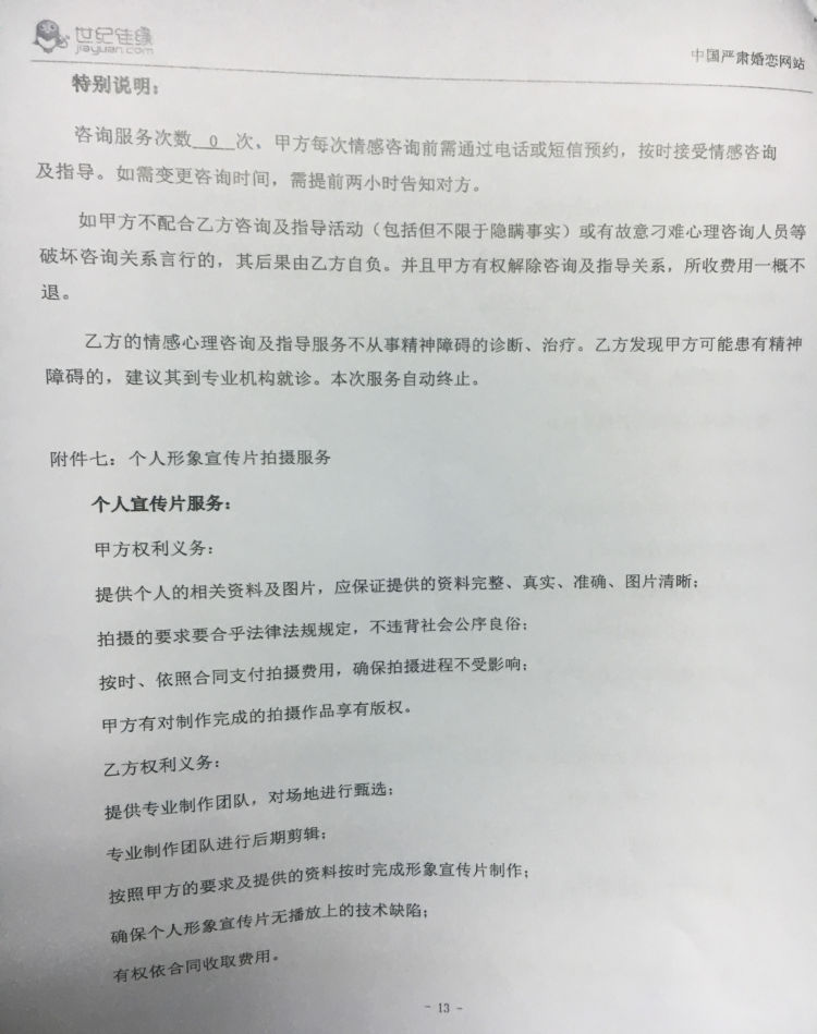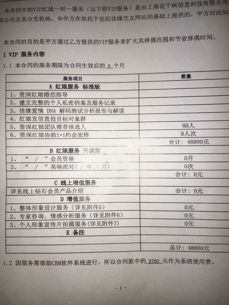 今年2月27日,劉小姐與世紀佳緣簽訂了一份繳款4.88萬的紅娘服務(wù)合同。合同服務(wù)期限為8個月,合同將根據(jù)其擇偶標準,由系統(tǒng)推薦60位候選人,其中紅娘協(xié)助線下約會安排8人次。此外,合同還包含三項增值服務(wù),包括整體形象設(shè)計,專家咨詢、情感分析服務(wù)和個人宣傳片服務(wù)。