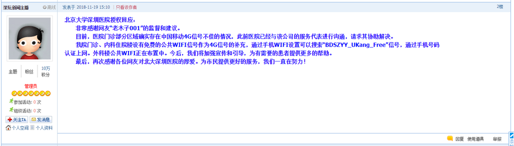 “我院門診、內(nèi)科住院樓設(shè)有免費的公共WIFI信號作為4G信號的補充,通過手機WIFI設(shè)置可以搜索‘BDSZYY_UKang_Free’信號,通過手機號碼認(rèn)證上網(wǎng)。外科樓公共WIFI正在布置中。”北大深圳醫(yī)院回應(yīng)稱。北大深圳醫(yī)院同時表示,關(guān)于醫(yī)院門診部分區(qū)域存在中國移動4G信號不佳的情況,醫(yī)院已經(jīng)與中國移動的服務(wù)代表進行溝通,請求協(xié)助解決,下來也會加強宣傳和引導(dǎo),為有需要的患者提供的幫助。