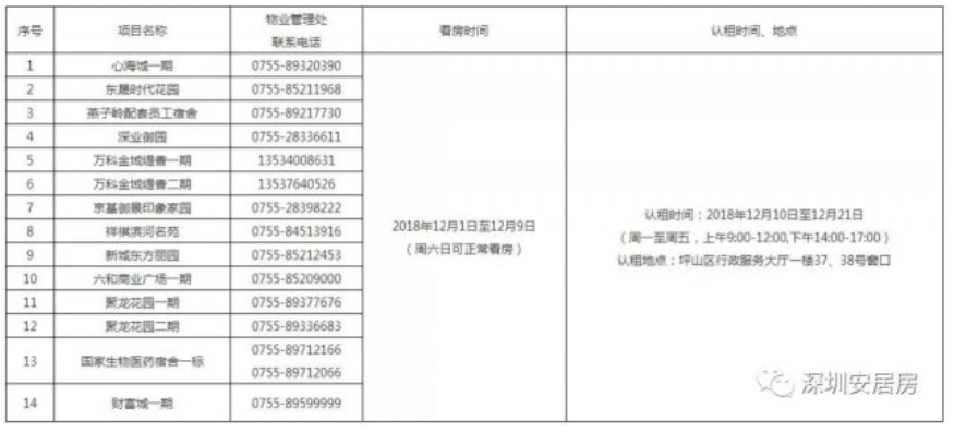 (三)統(tǒng)籌考慮本次配租房源實際供應(yīng)數(shù)量和在庫輪候人需求情況,坪山在庫輪候家庭和企(事)業(yè)單位申請時間至2018年11月30日。如仍有房源需求的個人和企(事)業(yè)單位請在規(guī)定時間內(nèi)遞交申請資料。
