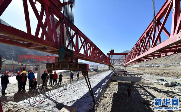 中鐵大橋局工作人員在拉薩至那曲高等級(jí)公路昂嘎大橋施工現(xiàn)場作業(yè)。新華社記者覺果 攝