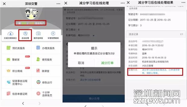 獲得記分后,可打開深圳交警星級用戶入口(微信公眾號(hào)、支付寶城市服務(wù)、深圳交警APP),點(diǎn)擊“違法處理-使用減分學(xué)習(xí)獲得記分處理交通違法”申請辦理,2個(gè)工作日內(nèi)完成審核,申請人可在線繳款,處理完畢。值得注意的是,減分學(xué)習(xí)獲得的記分只能處理深圳車在深圳范圍內(nèi)的交通監(jiān)控設(shè)備的交通違法,并且單次處理的交通違法記分不得超過3分,一次記分周期內(nèi)使用此部分記分處理不得超過6分。